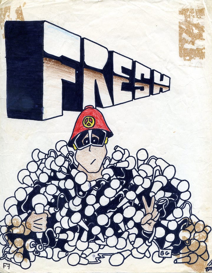 There were some older kids in my neighborhood - a few from New York - that formed a crew I looked up to and wanted to be down so bad. Everyone was breaking, deejaying, and emceeing but no one around me embraced the visual side of Hip Hop. Probably because it was highly illegal and seen mostly as a trains only in New York thing then.